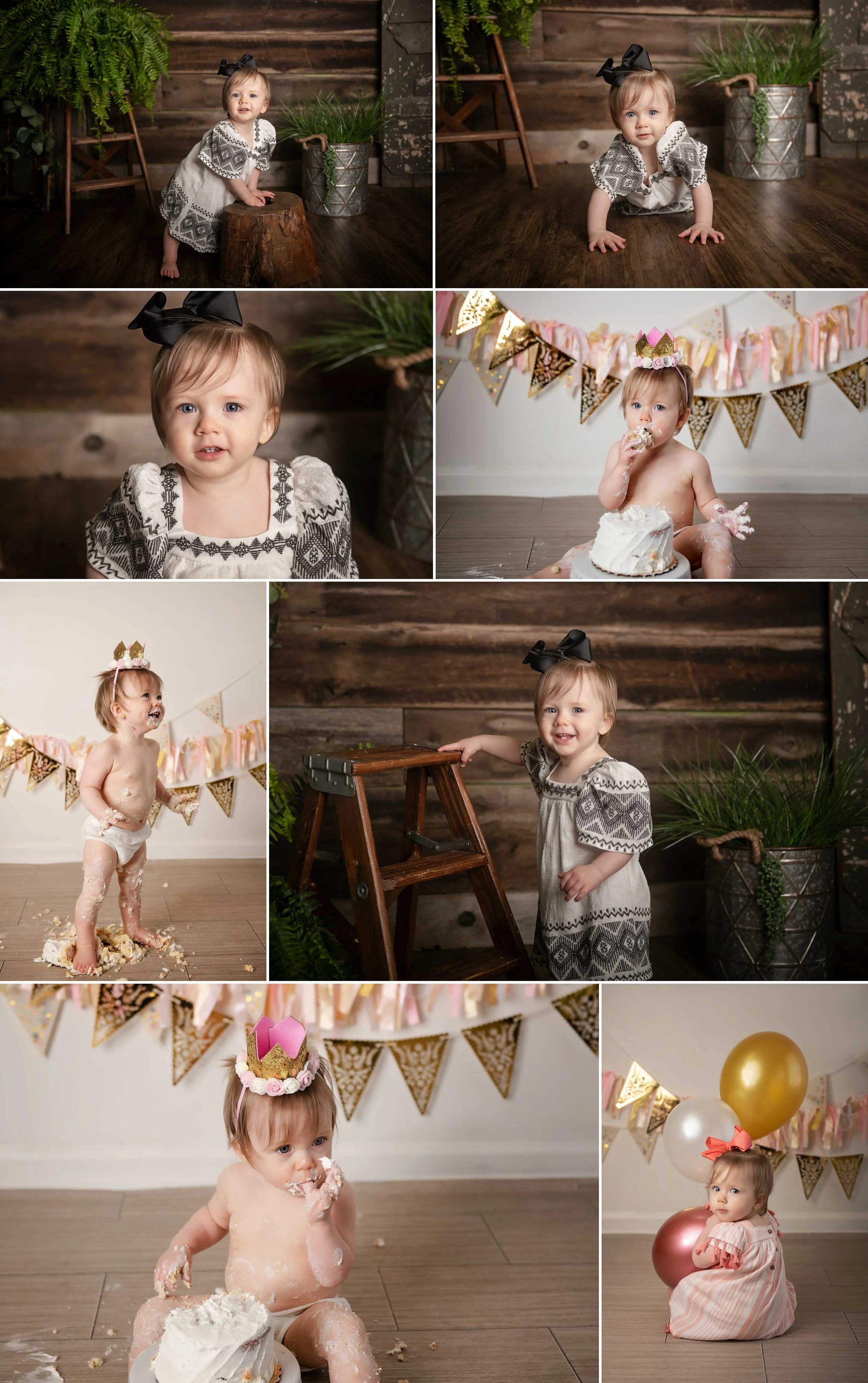 We LOVE creating scenes for our clients. We just let our creative side run with it and have fun. So for little miss, mom knew gold and pink was exactly what she wanted! Thankfully our studio is stocked with cake smash banners and decorations and we glammed it up! Happy First Birthday!!!